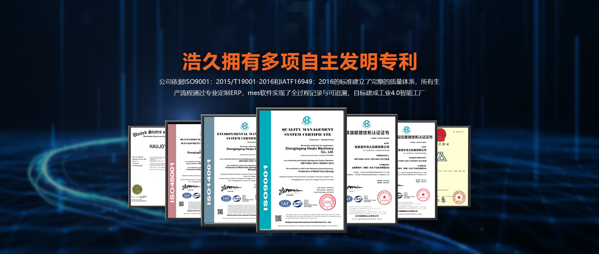 浩久擁有多項自主發(fā)明專利。公司依據(jù)ISO9001GB/T19001-2016和IATF:2016的標準建立了完整的質(zhì)量體系,所有生產(chǎn)流程通過專業(yè)定制ERP,mes軟件實現(xiàn)了全過程記錄與可追溯,目標建成工業(yè)4.0智能工廠。
